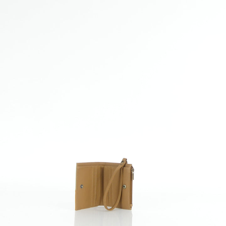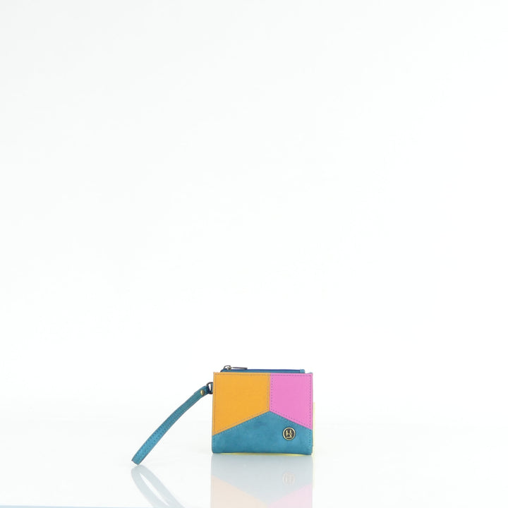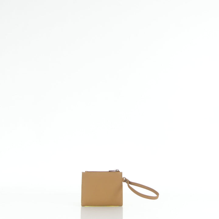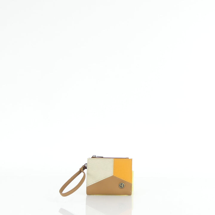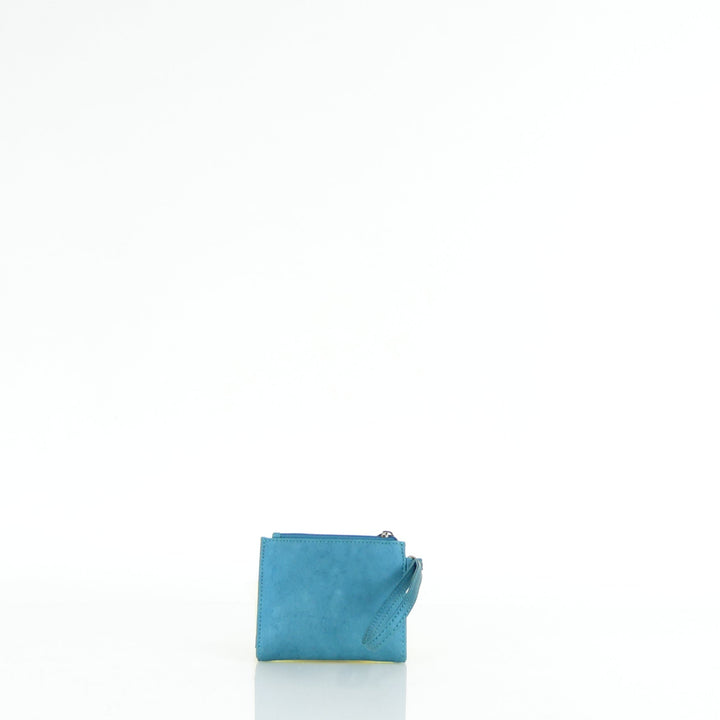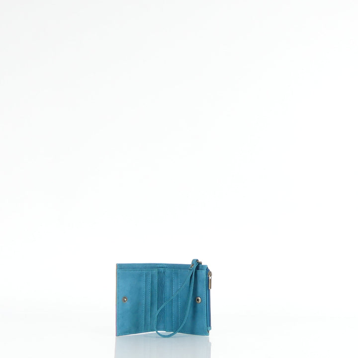 Electra tiene dos compartimientos: uno para monedero con cierre de cremallera y otro para tarjetas, con una división para billetes. Además, cuenta con una manija corta contando con un cierre de broche.