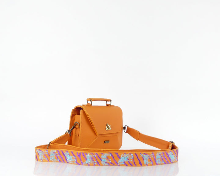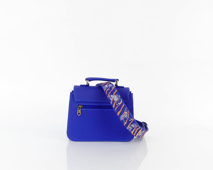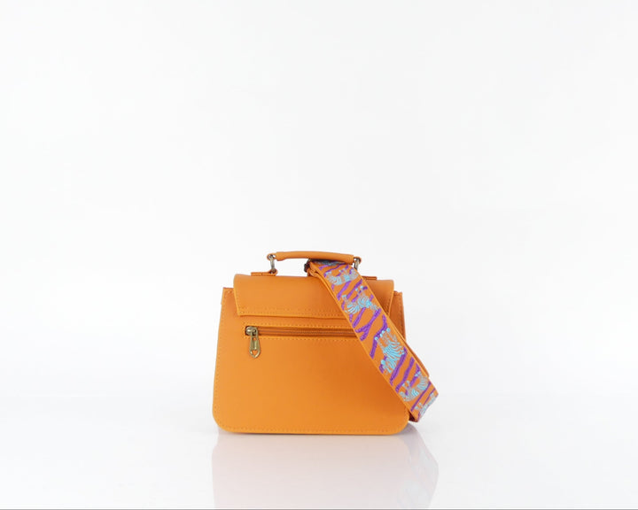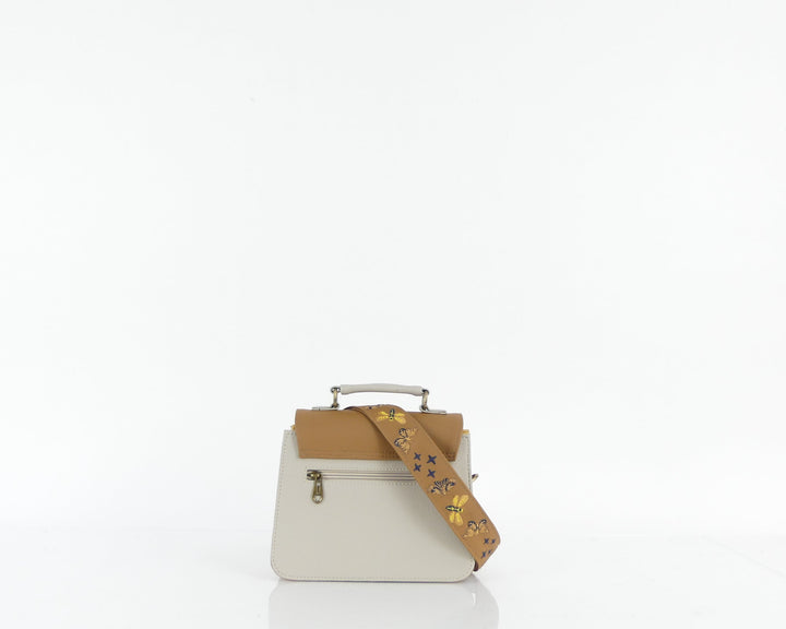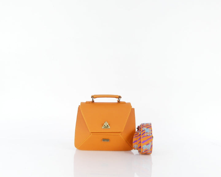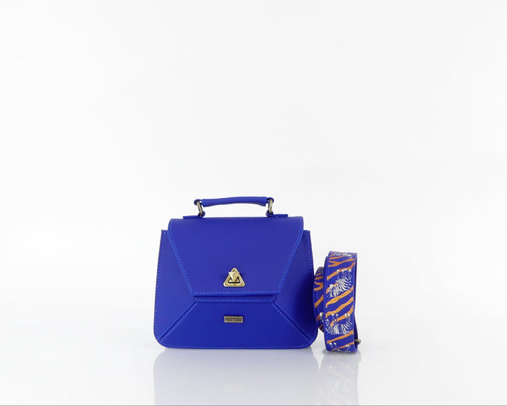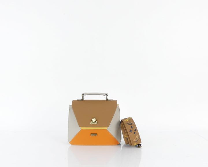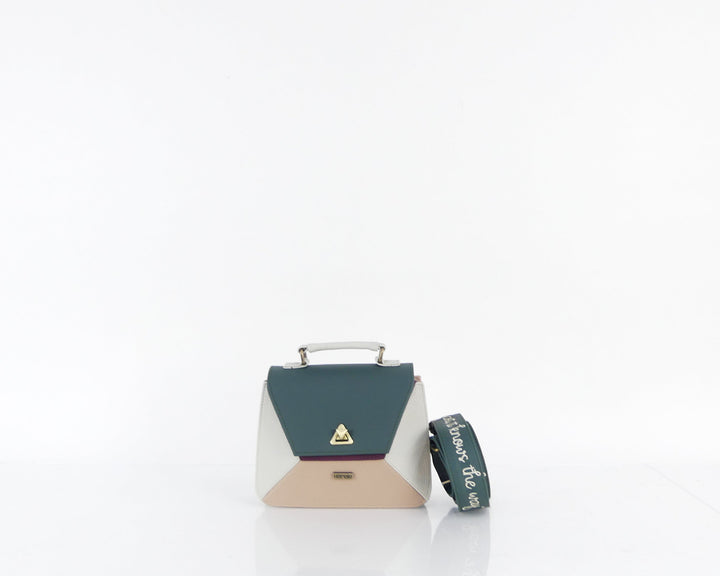 Es una bolsa con doble función: manija corta para llevar de mano y correa larga extraíble para usarla como bolso cruzado. Tiene un bolsillo interno con cremallera, un bolsillo sencillo y uno externo en la parte trasera. El cierre principal es de cremallera y la tapa se cierra con un herraje en torniquete en forma de triángulo.